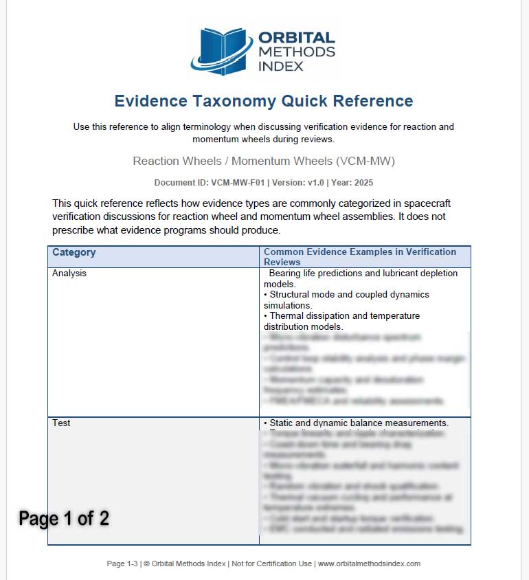 The OMI Evidence Taxonomy Quick Reference — Momentum Wheels provides a concise, non-prescriptive orientation to how verification evidence is commonly categorized and discussed for reaction wheel and momentum wheel assemblies during spacecraft reviews.